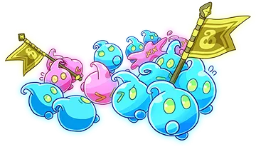 スライムを召喚して増やし、制限時間内にマップ上に配置された小旗をより多く確保した方の勝ちです。小旗を先に3つ確保するか、相手陣の大旗を回収するとノックアウト勝利!